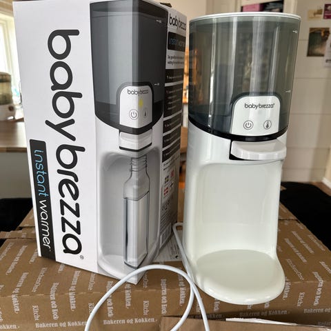 Baby Brezza flaskevarmer og pulverdispenser for morsmelkerstatning. Enheten er beregnet for tilberedning av tåteflasker med morsmelkerstatning ved å dosere pulver og vann automatisk. Passer til bruk på kjøkkenbenk og er egnet for foreldre som ønsker jevn temperatur og riktig blandingsforhold på flaskene. Designet med frontbetjening og plass til flaske under dispenseren.