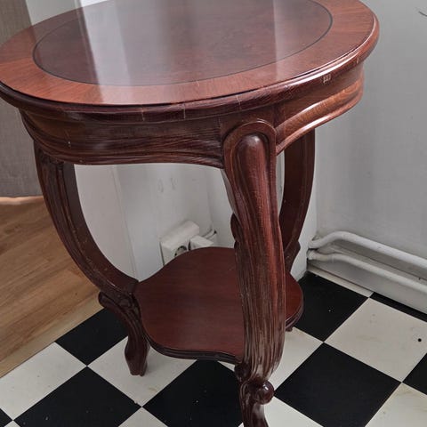 Blomsterdekorert rundt sidebord i tre. Bordet har utskåret, profilert bordplate med intarsia/blomsterdekor i midten og langs kanten. Understellet består av en dreid søylefot med tre buede ben. Passer som lite stuebord, lampebord eller avlastningsbord i stue, gang eller soverom.