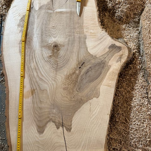 Alm plank i heltre. Planken har naturlig kant og synlige årringer og kvister. Egner seg til bruk i snekkerarbeid, for eksempel bordplate, benk, hylle eller andre møbelprosjekter. 75x135x5,5cm.