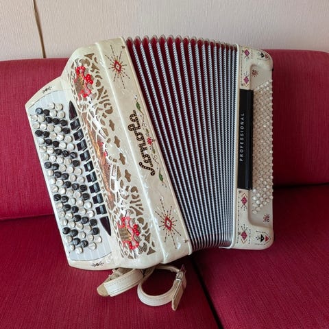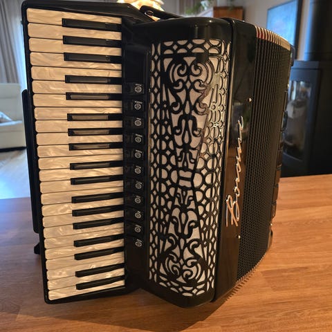 Lekkert Regent Scandalli selges. Det er fra perioden ca. 1920-1945, og er i sjeldent god stand for alderen. Det har 96 basser, og 4 og en halv oktavs rekkevidde. Et par av bassknappene henger litt, men det skulle være relativt enkelt å fikse. Ellers er det stemt, reimene er i god stand, og det følger med kasse. Kan prøves i Oslo sentrum, eller sendes på kjøpers ansvar.