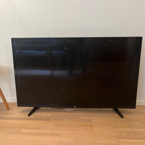 LG SMART LED-TV. TV-en har slank ramme og står på to føtter. Den har smart-TV-funksjoner med tilgang til strømmetjenester som blant annet Netflix, slik det vises på bildet. Bakpanelet har tilkoblinger for strøm og ulike lyd- og bildeinnganger. Egner seg som hoved-TV i stue eller som ekstra-TV i andre rom. Nøyaktig modellbetegnelse og skjermstørrelse fremgår av etiketten på baksiden av TV-en.