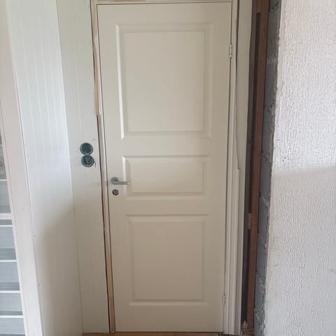 Innerdør med glassfelt i hvitmalt tre. Leveres med dørkarm i treverk og terskel, samt dørhåndtak og låskasse montert. Egnet som innerdør mellom rom i bolig eller hytte der man ønsker lysgjennomgang samtidig som rommene skilles av.