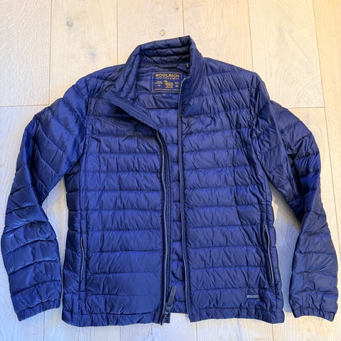 Woolrich jakke for herre i størrelse L. Jakken er svart og fylt med dun. Den har hette og glidelåslukking foran. Yttermaterialet er glatt med vatterte partier på kroppen. Egnet som ytterjakke i kjøligere vær.