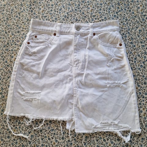 NA-KD denimskjørt for dame i størrelse S. Skjørtet er laget i denim og har hvit farge. Kort modell med klassisk jeanslukking foran og synlige sømmer. Passer til hverdagsbruk og kan kombineres med ulike topper og jakker.