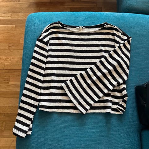 Selger tanktopp fra H&M i størrelse M. Sort og hvite stripete, med ribbet stoff. Pent brukt.