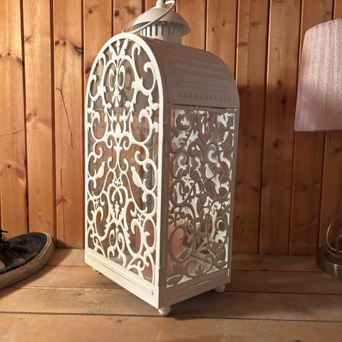 Vakker lyslykt i sølvfarge med glassprismer. Lager et fantastisk lys fra flammene.