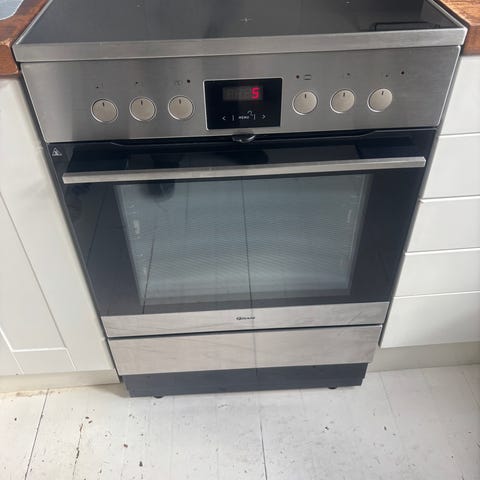 Gram keramisk komfyr med platetopp og stekeovn. Komfyren har keramisk koketopp med flere kokesoner og frontbetjente brytere. Den har integrert stekeovn med glassdør og visning gjennom fronten, samt digitalt display og betjeningsknapper over ovnsdøren. Ytre utførelse i stål/farget front tilpasset innbygging mellom kjøkkenbenker. Egnet som frittstående komfyr i standard kjøkkenløsning.