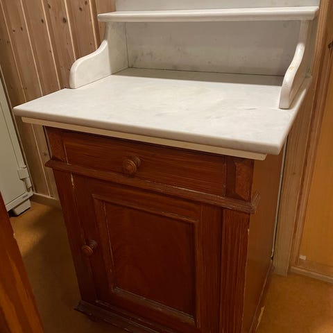 Pent og dekorativt vaskeskap/vaskekommode med marmortopp med en skuff i tillegg til skapet. Marmortoppen mangler en liten hylle, men skapet er i god stand ellers.