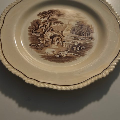 Fatet har lys bunnfarge med spraglet kantdekor i brune toner.