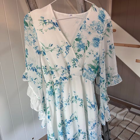 ONLY sommerkjole for dame i størrelse XL. Kjolen er laget i polyester og har et flerfarget blomstermønster. Den har lange ermer og V-utringning foran. Stoffet er lett og egner seg til bruk på varme dager eller til hverdagsbruk og enkle anledninger. Fargen er lys og mørk grønn. Veldig fin