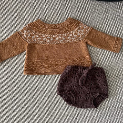 Brun hjemmestrikket kofte selges. Omtrent str 62. Helt nydelig, kun brukt et par ganger da de små vokser altfor fort.