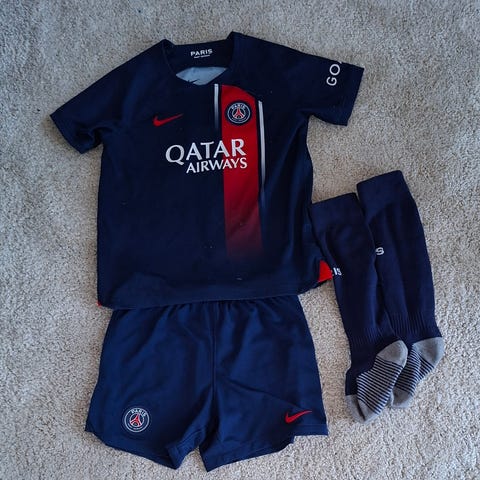 Paris Saint-Germain Neymar Jr 10 fotballdraktsett for barn i blå farge. Sett består av kortermet drakttrøye med Qatar Airways-logo og PSG-emblem, shorts med nummer 10 og tilhørende blå fotballsokker. Trøyen har Neymar Jr og nummer 10 på ryggen. Egnet til bruk på trening, kamp eller fritidsspill for barn som ønsker PSG-inspirert fotballtøy.
