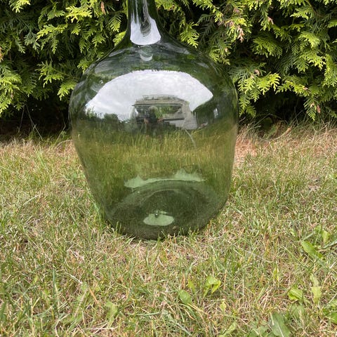 Tre store grønne glassflasker med håndtak ved halse. Og en brun glassflaske.