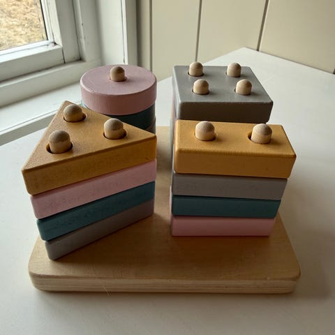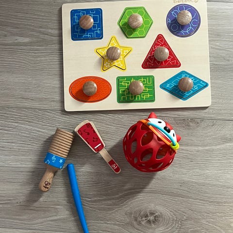 Pent brukte babyleker fra Sebra. Byggeklosser i stoff med symboler, tall, speil og bokstaver. Noen har også rangle inni. Puslespill i tre med seilbåter. Sammenleggbar babyleke som er fint til for eksempel magetrening, da det gir babyen noe å se på.