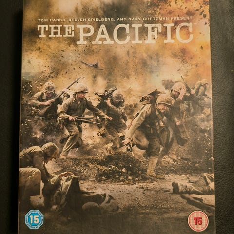 HBO The Pacific DVD-boks. Miniserie om andre verdenskrig i Stillehavet. Esken inneholder serien på DVD med flere episoder fordelt på flere plater. Aldersgrense 15 år, regionkode som angitt på baksiden av omslaget. Egnet for avspilling på kompatible DVD-spillere som støtter denne regionkoden og aldersmerkingen.