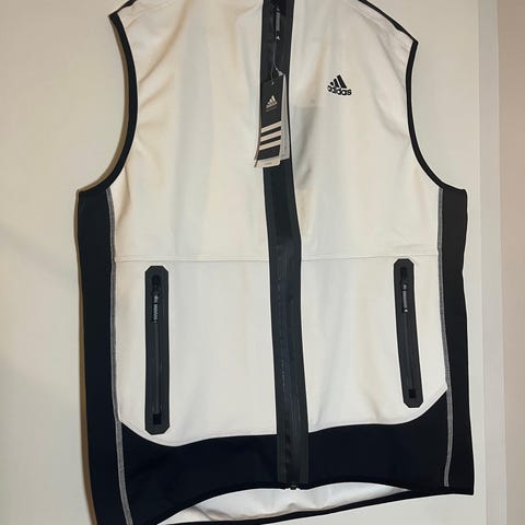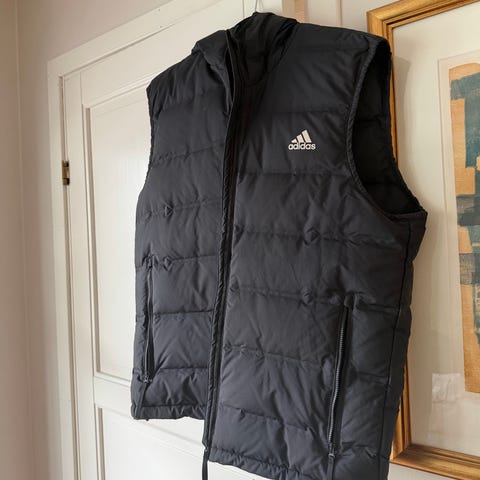 Adidas vest for herre i størrelse M. Vesten er svart og laget i fleece-materiale. Modellen har høy krage, hel glidelås i front og sidelommer. Klassiske Adidas-detaljer med logo på brystet og striper på skuldrene. Egnet som et ekstra lag til hverdagsbruk eller lett utendørsaktivitet.