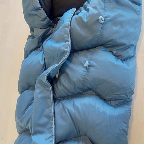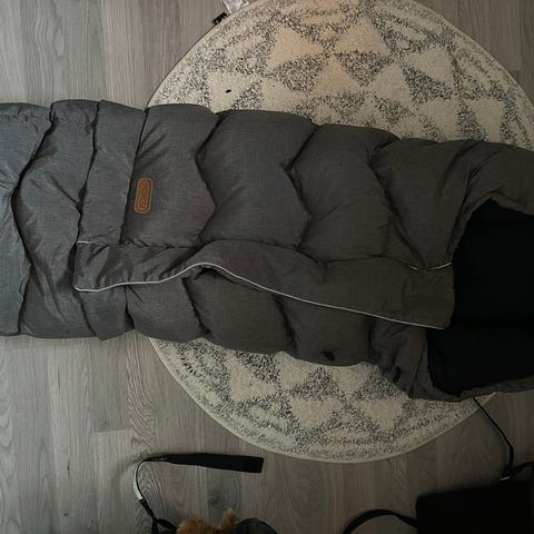 Den er en eldre modell som kan brukes i alle årstider ved å ta ut dynen som ligger inni. Den blir stor med dynen i, så den passer kanskje bedre til store barnevogner. Den kan åpnes helt og brukes som lekematte. Må hentes.