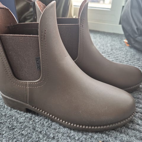 Horze gummistøvler i svart. Klassisk modell med elastiske sidepaneler og lav hæl. Glatt overflate som er enkel å rengjøre.