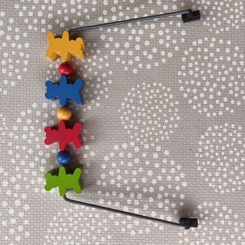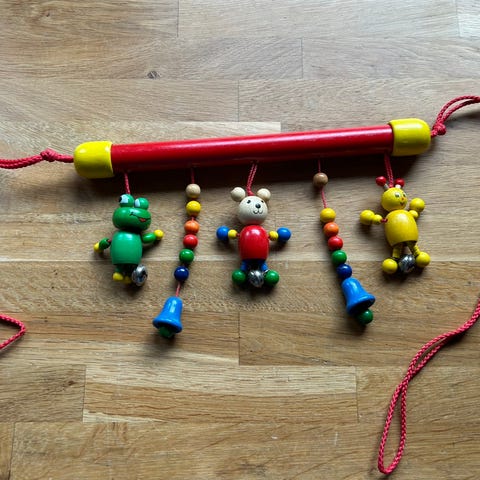 Leken passer til vippestolene til Babybjørn. Leken er i tre, med "stålramme".