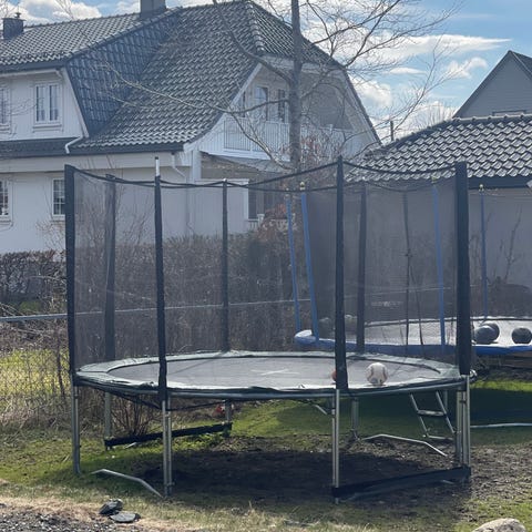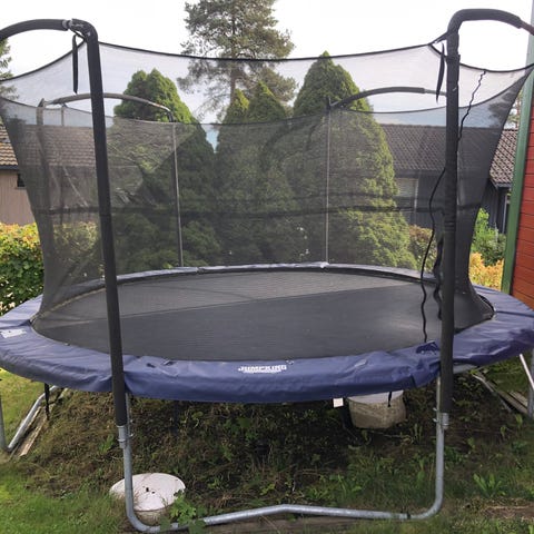 Brukt rektangulær trampoline selges som den er. Fortsatt god sprett, sikkerhetsnettet og glidelås i relativt god stand, med en rift i nettet ved toppen av glidelås. En spiral mangler. Meget solid konstruksjon og høy kvalitet. Trampolinen har blitt demontert og oppbevart innendørs vinterstid.