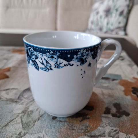 blomsterdekor langs kanten. Kruset har hank og passer til servering av varme drikker som kaffe, te eller kakao. Designet er dekorativt med detaljert mønster øverst på kruset. Egner seg til bruk på kjøkken og i spisestue, både til hverdags og ved enklere servering.