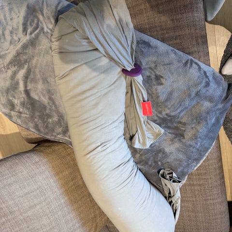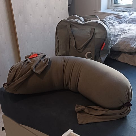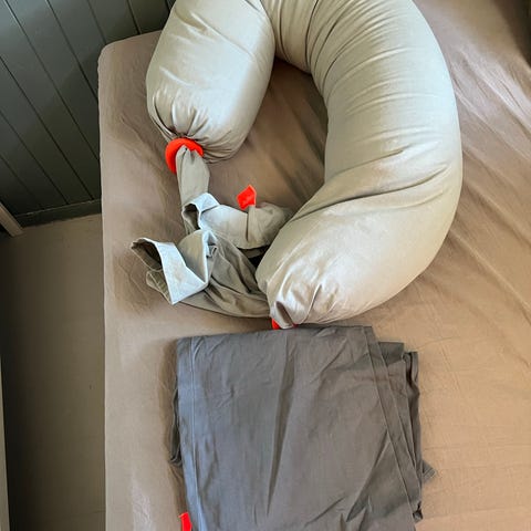 God og formbar graviditetspute. Nyvasket, fungerer utmerket. Mangler den ene oransje klemma, men fungerer helt fint ved å knyte den ene siden.