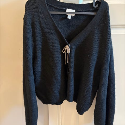 Solene cardigan, oppskrift av Moreca Knits. Strikket i fargen svart i garnet Drops Nepal (65% ull, 35% alpakka). Pent brukt, kun brukt et par ganger. Størrelse L.