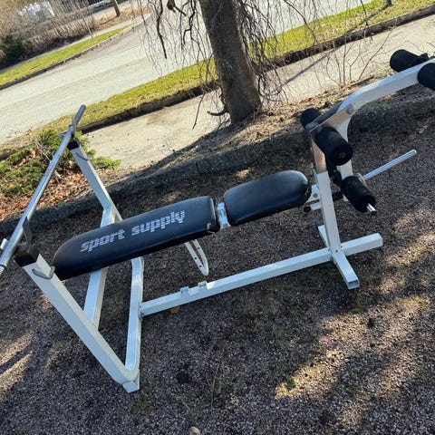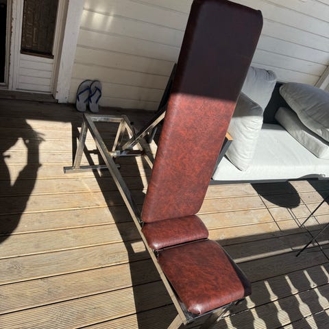 Treningsbenk med integrert vektstativ. Benken har polstret sete i rød farge og solid metallramme. Vektstativet har faste holdere til vektstang. Egnet til styrketrening med frivekter, for eksempel benkpress og lignende øvelser. Passer til bruk i hjemmegym eller enklere treningsrom. Helsveist egenproduksjon.