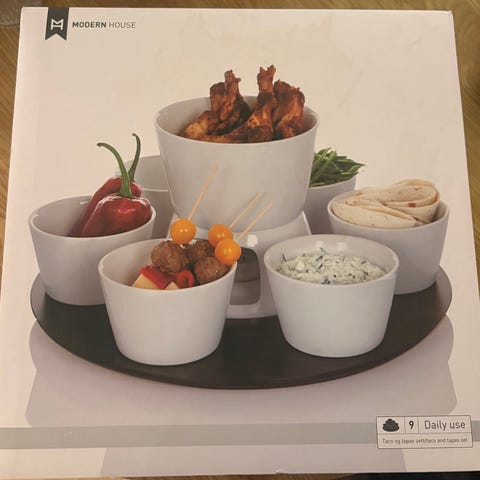 Modern House Daily use serveringsfat 350 kr. Modern House tapassett 5 deler Hvit/Bambus 400 kr. Pakken inneholder et rundt serveringsfat med flere rom, egnet for servering av for eksempel ost, frukt eller snacks. I tillegg følger et rektangulært serveringssett med større form og mindre skåler på stativ, egnet til salat, sauser eller tilbehør. Begge deler er beregnet til bruk på kjøkken og ved servering av mat.