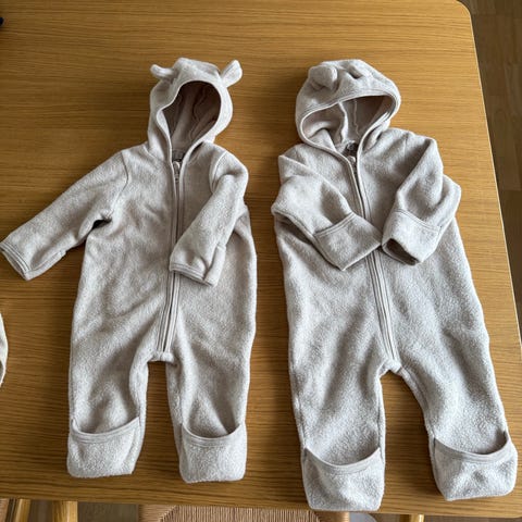 Myk heldress til baby i ullfleece. Pent brukt. Strl 56/62. Brukt frem til 62 i andre klær. Kan brette inn og ut hender og føtter. Lue med ører og praktisk glidelås — perfekt for kjølige dager. Dyre og røykfritt hjem. Nyvasket. Nypris 999 kr.