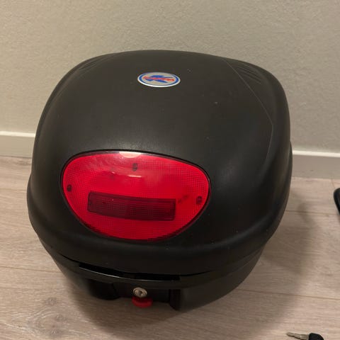 Peugeot toppboks til scooter med tilhørende festebrakett og bakre bærer. Toppboksen har rød refleksfelt bak og leveres med monteringsplate som festes på bæreren. Egnet for oppbevaring av hjelm og annet utstyr på scooter eller lett MC. Settet består av toppboks, bakre bærer i metall og monteringsplate i plast.