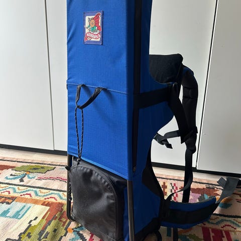 Kjempe praktisk bæremeis med seler og ekstra pute for to høyder. Kjempegod å bære. Litt slitt i stålramme og litt gammel gjørme fra skogtur, men kjempefin stand og god å bære