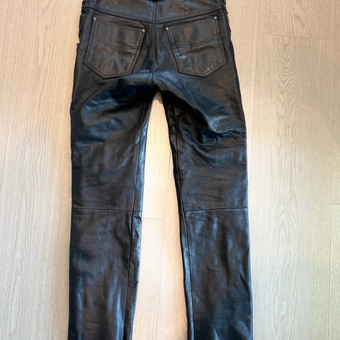 Iofama skinnbukse med seler i svart farge, størrelse 48. Bukse i hel lengde med justerbare seler og glidelåser nederst på bena. Flere glidelåslommer foran. Passer for bruk der man ønsker en slitesterk skinnbukse med god bevegelsesfrihet og støtte fra selene.