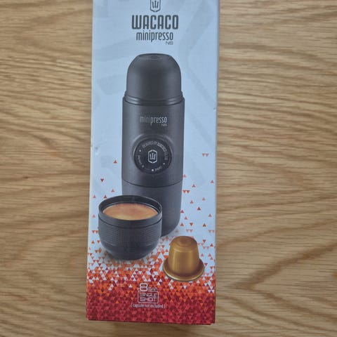 Brukt to ganger. Med Wacaco Minipresso GR kan du lage en espresso hvor du vil - det unike med Wacaco Minipresso er at den ikke trenger strøm! Med sin lette, kompakte design passer den spesielt bra for å ta med i sekken før camping eller neste sykkeltur. Med det smarte pumpesystemet kan du oppnå 8 bar, som egner seg godt til espresso. Et gjenbrukbart espressofilter er inkludert.