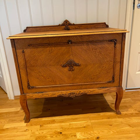 Antikk skatoll / kommode i brunbeiset treverk med utskårne dekorative felter på fronten. Møbelet har to dører foran med relieffmønster og en kraftig sokkel med profilerte detaljer og føtter. Topplaten har faset kant og synlig trestruktur. Egner seg som oppbevaringsmøbel i stue, gang eller soverom, og kan brukes til lagring av tekstiler, servise eller andre gjenstander.