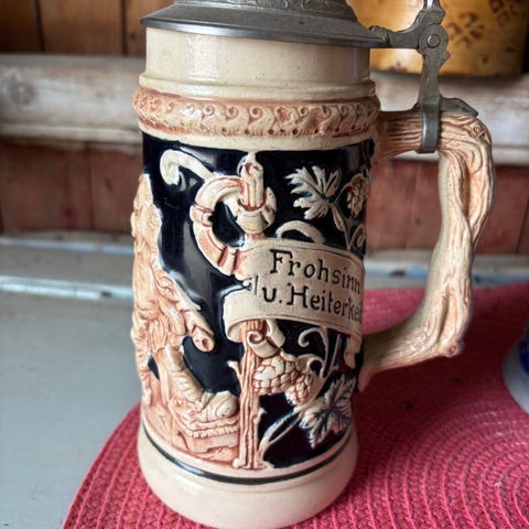 Fint tysk ølkrus med lokk keramikk flerfarget