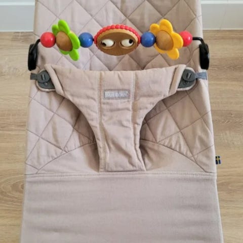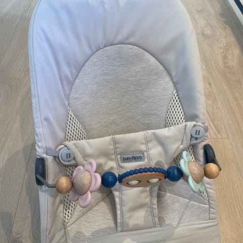Stolen har justerbar ramme i metall og avtakbar bøyle med fargerike leker foran. .Vippestolen har flere bruksmåter: Lek, slapp av, barnestol og sov. med integrert sele for å holde barnet på plass. Trekket kan tas av for rengjøring.