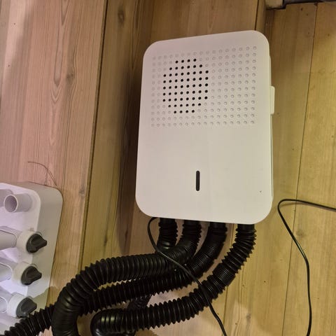KI: Color elektrisk hansketørker med fire varmeelementer. Enheten har plass til opptil fire hansker eller sko samtidig og kobles til strøm via ledning. Varmeelementene er utformet som rør som leder varm luft inn i hansker eller fottøy for å tørke dem innvendig. Passer til bruk i hjemmet, for eksempel til tørking av våte hansker, votter eller sko etter bruk i regn eller snø.