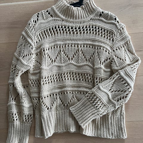 Farven er grå. Hullmønster og splitt i sidene. Den er romslig i størrelsen og kan derfor passe som oversized til en xsmall og mere tettsittende til en medium