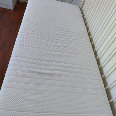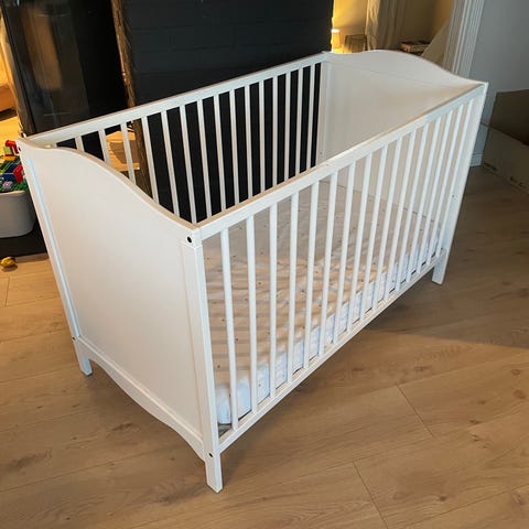 IKEA barneseng med madrass i hvitlakkert metall. Sengen har spiler i hode- og fotende samt på sidene, og leveres med ribbebunn i tre. Madrassen er tilpasset sengens mål og har et lyst trekk. Passer som seng til barn på barnerom eller gjesterom. Enkel, klassisk utforming som gjør det lett å plassere sengen sammen med annet interiør.