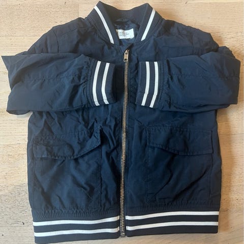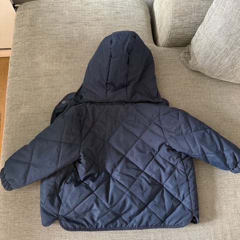 H&M jakke for barn i størrelse 98. Jakken er mørkeblå. Den har hette, quiltet mønster og lukkes med trykknapper foran. To frontlommer. Unisex-modell som passer både gutter og jenter.