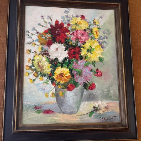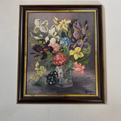 Akvarellmaleri med motiv av blomster i vase, utført av ukjent kunstner. Bildet viser en bukett med blomster i varme jordfarger mot en lys bakgrunn. Kunstverket er innrammet med passepartout og ramme Obs Kan ikke sendes