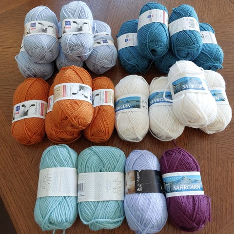Selger samlet 35 nøster bomull sportgarn 600,- som tilsvarer ca 17,- pr nøste Hver farge er samme fargenummer.