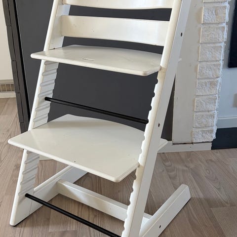 Stokke Tripp Trapp høy barnestol i hvitmalt tre. Stolen har justerbar sitteplate og fotbrett som kan tilpasses barnets høyde. Egnet som spise- og sitteplass ved bord for barn i ulike aldre. Klassisk Tripp Trapp-konstruksjon med solid ramme i treverk og tverrstag for stabilitet. Farge: hvit. Materiale: tre.