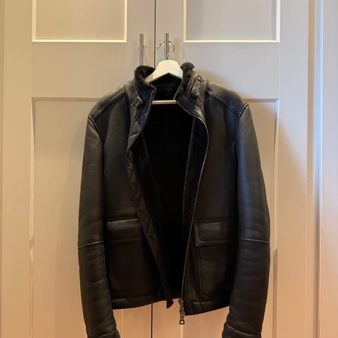 En gang brukt klær ,Selected skinnjakke for herre i størrelse M. Jakken er svart og laget av ekte skinn med ullfôr av saueull på innsiden. Den har høy krage med spenne, glidelåslukking foran og to frontlommer med glidelås. Klassisk, rett passform som passer til bruk i kjøligere vær.