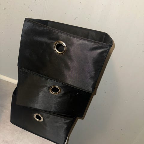 IKEA skubb skittentøyskurver i tekstil, svart farge. To separate, kurver med lokk. Kurvene har «lokk» og håndtak for enkel håndtering. Egnet til oppbevaring av skittentøy eller annen tekstiloppbevaring i hjemmet. Laget i lett tekstilmateriale, men holder fasongen når de er i bruk på grunn av ramme i metall.