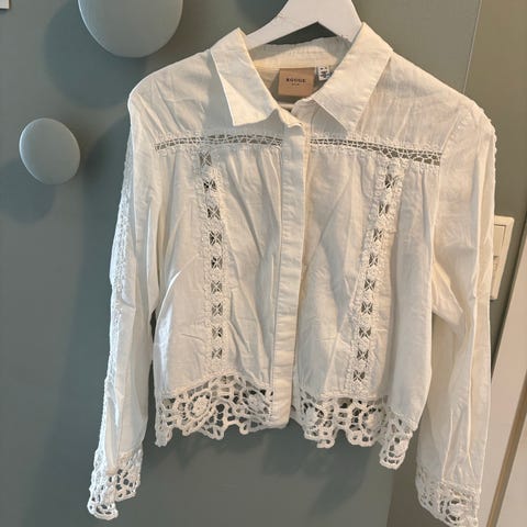 Hvit bluse/skjorte med brodert hullmønster og spiss krage. Knapper i front.