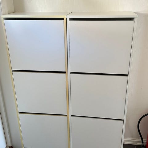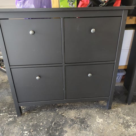 Praktisk og grei skohylle, malt i grønn farge og skiftet knotter. Hentes på Dvergsnes.