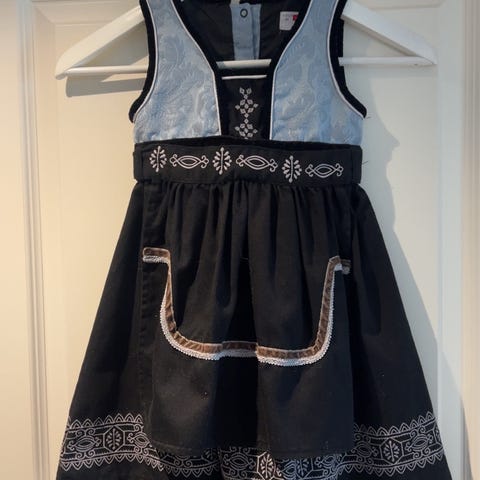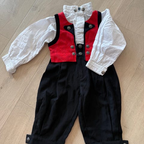 Fin festdrakt til gutt. Brukt rundt 4-5 ganger. Noen merker på buksen, men er ikke veldig synlig. Har bare vasket litt med vann, men kan være det går vekk ved vask. Selges derfor billig.