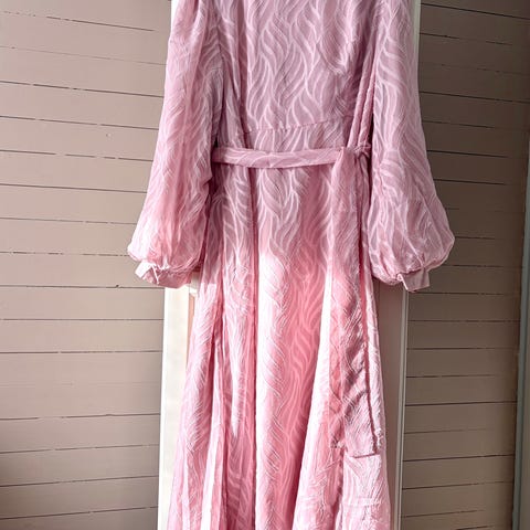 V-formet hals og figurvennlig fasong. Krepp/chiffon. Drapering foran på midjen. Lange, brede puffermer. Trikotfôr. Lengde 147cm